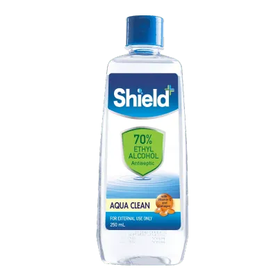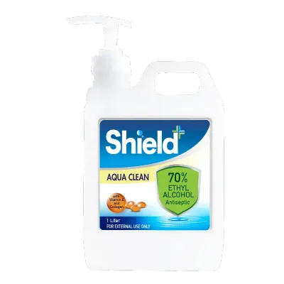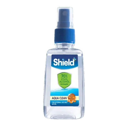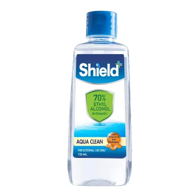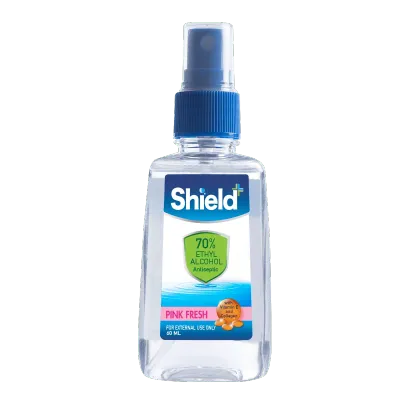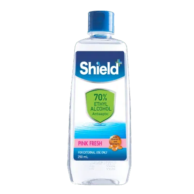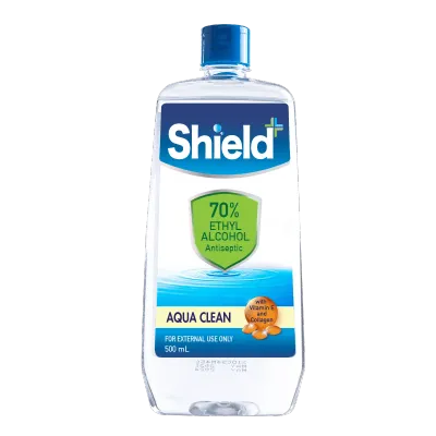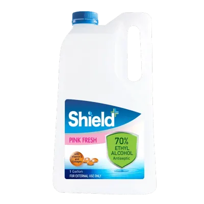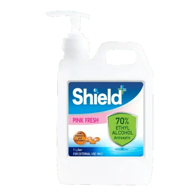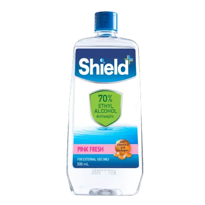 Shield+ 70% Ethyl Alcohol is enriched with Vitamin E, Collagen, and Glycerin for advanced skin protection, available in two refreshing and perfume-like scents- Aqua Clean and Pink Fresh.